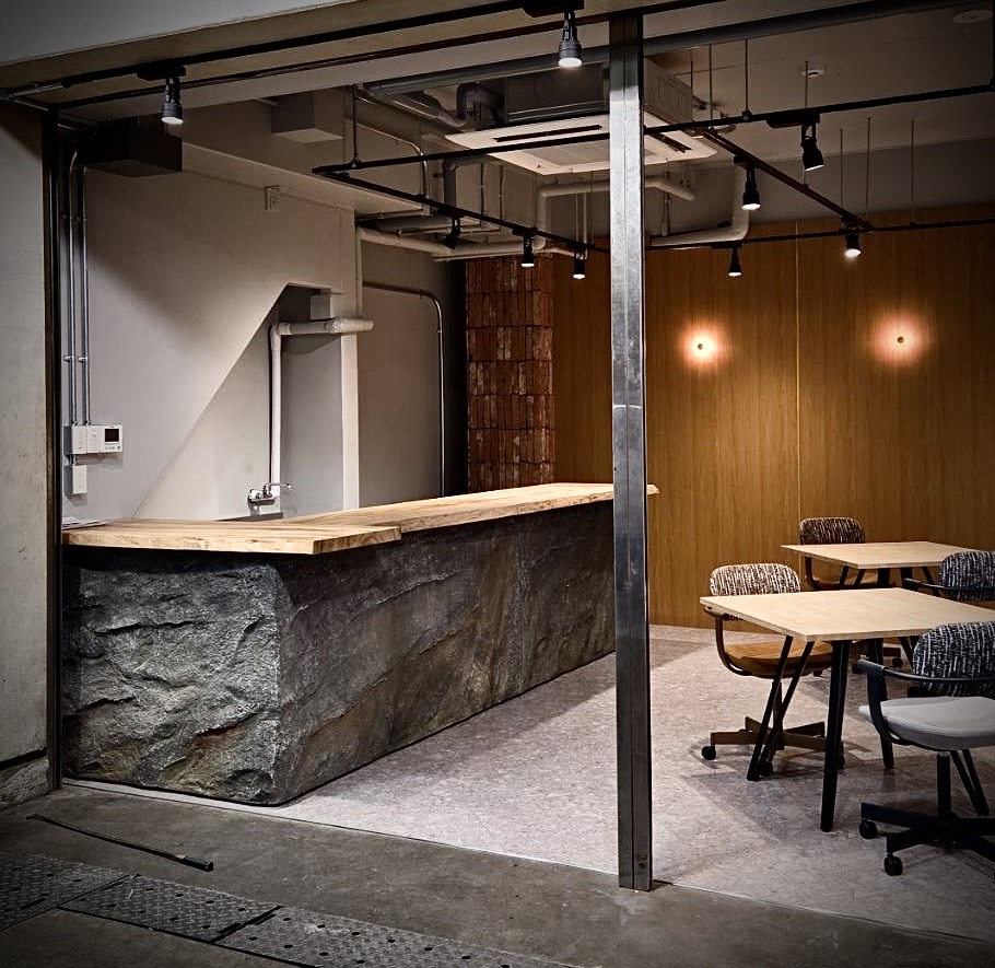 岩肌のような表情と重厚感が、無機質な構造体と木の素材感をつなぎ、 空間全体に統一感と奥行きを与えます。 視線を引きつける造形は、空間の印象を大きく左右する要素として存在感を放ちます。
